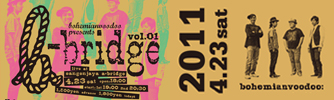 2010年8月28日にデビューアルバム『Lapis Lazuli』リリースライブをした伝説の地「三軒茶屋a-bridge」。あの瞬間、あの空間に100名以上のオーディエンスが押し寄せ、ボヘ史上最高のステージだったとの呼び声も高い。ニューアルバム発売後、遂に地元モーションブルーまで超満員にしたbohemianvoodooがまた、原点a-bridgeに帰ってくる。今回からbohemianvoodoo×a-bridgeとして新たなイベント「b-bridge」始動。さらにパワーアップしたボヘと、あの時とまったく同じゲストメンバーと共に、また伝説を皆さんと一緒に作りましょう!!