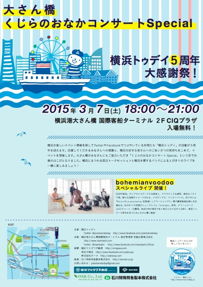 横浜の楽しいイベント情報を探してTwitterやFacebookでつぶやいている仲間たち「横浜トゥディ」の活動が5周年を迎えます。応援してくださるみなさんへの感謝と、横浜大好きなみなさんへのごあいさつの気持ちをこめて、イベントを開催します。大さん橋のみなさんにもご協力いただき「くじらのおなかコンサートSpecial」という形で共催のはこびとなりました。横浜にまつわる面白トークセッションと横浜を愛するバンドによるとびきりのライブを一緒に楽しみましょう!